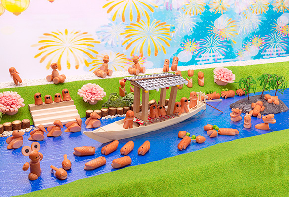 夏の暑い日!陸橋には、汽車が荷物を運んでいます。飾り切りの仲間達は川遊びやキャンプでのバーベキューを楽しんでいます。