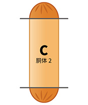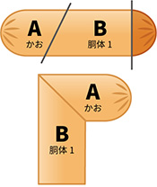 1本目のウインナーの1/3のところを切り取り、A(あたま)、B(胴体)を切り出します。AとBを図1のようにパスタでつなげます。(ハートの形を作る要領で)