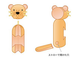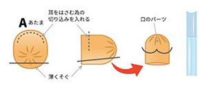 Aの下の部分を薄ぐそいで、図のようにカットしたストローで丸みをつけます。そして耳をはさむ為の切り込みも入れておきます。