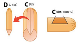 Cに縦にV字に切り込みを入れ、さらに横にしてもう一度V字に切り込みを入れます。最初に切り取ったパーツ(D)は尻尾に使います。