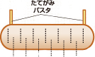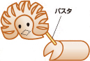 3で切った半分のたてがみに約5mm間隔で切れ目を入れ(切り落としてしまわないように注意)、手前半分を下まで切り落とします。両端にパスタを差します。