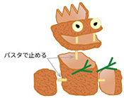 Bの胴体の両側にパスタでDをとめて足にし、その上にA(頭)をパスタでとめます。