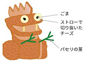 ストローでくり抜いたスライスチーズ2個に黒ごまをつけて目をつけ、怪獣の胸の部分にパセリの茎を差して手をつければ出来上がり。