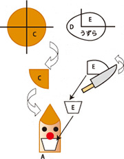 ハムを4分の1に切り、うずらの水煮を下図のようにL字に切ります。切り取ったうずらの部分から白身の部分を薄く剥いてヒゲを作ります。目は黒ごま、鼻はレッドペッパーやケチャップを付け、1/4に切ったハムを頭に巻き顔を作ります。