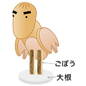 煮ゴボウ(足)を横2mm縦2cmに2本切り、D(胴体)に差し込み、土台の大根に差し込み出来上がり。