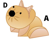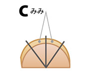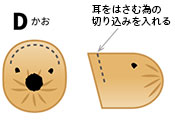 C(みみ)を図のように両端を三角に切り、D(かお)の切り込みに差し込み耳の完成です。