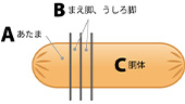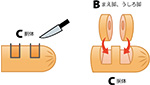 1のCに5mm幅でウインナーの半分まで4回切り込みを入れ、図のように2か所を切り取り、そこにBをはめ込んで、BC一緒にパスタでとめます。