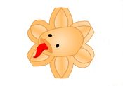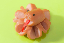 もう1本のBウインナーの1/3部分をカットする。2/3部分の先端にVの字に切りパプリカ(舌)を5mm幅、1cmの長さに切りVの字に入れ、ゴマで目を入れ出来上がり。