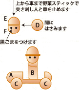 EとFの間にDをはさみ、Fに黒ごまで目をつけBを縦にして上から最初に楊枝で穴をあけ野菜スティックで人と車をとめてできあがりです。