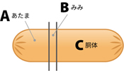 ウインナーの1/3部分を切り取り、A(あたま)、B(みみ)、C(胴体)を切り出します。