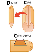 C(胴体)の中央部分にV字の切り込みを入れ、D(しっぽ)を切り出します。さらにハの字に切り込みを入れ、おなか部分を切り取ります。