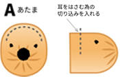 A(あたま)の頭頂部に5mm程の切り込みを入れ、みみを挟みます。
