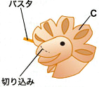 Aの部分にジャバラ切りしたCを巻き付けパスタで左右をとめ、Aの先端に3mm幅に切り込みを入れる。