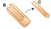 胴体(B)をタテにV字の溝を入れ、切り取った(C)は尻尾になります。