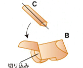 尻尾部分(C)を、半分に切り胴体(B)下に、5mmの切り込みを入れ尻尾(C)を差し込みます。