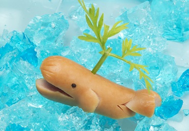 丸く切ったのりで目をつけ、切り込みに尾ひれをはさみます。 パセリを指し、潮を吹かせて完成です。