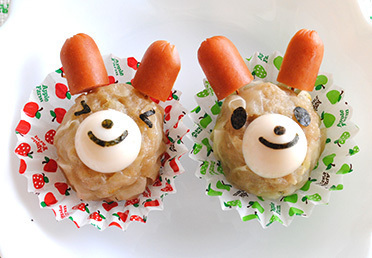 1のごはんを80gと10gに分け、ラップを使って大小の楕円のおにぎりをつくる。おにぎりにくぼみをつけ、そこへ焼売を入れてラップでととのえる。丸く抜いたチーズを真ん中にのせ、グリンピースをスパゲッティで固定する。