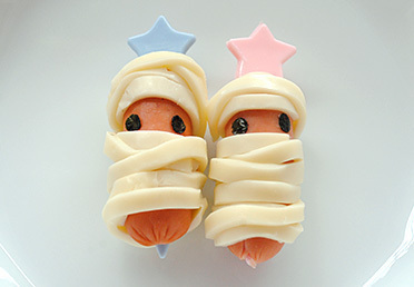 ウイニーは縦半分に切る。きゅうりの皮部分を2本斜めにおき、スパゲッティで固定する。