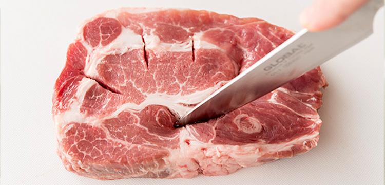 加熱したときのお肉の収縮を抑え、きれいに仕上げるための筋切り。調理の際にぜひ取り入れてみてください。