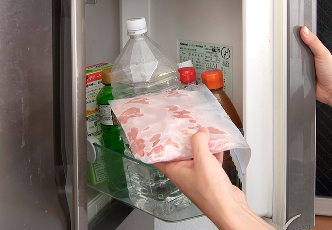 料理をする半日くらい前に冷蔵庫に移し、じっくりと時間をかけて解凍すると細菌の繁殖が抑えられます。そのため常温解凍は勧められません。電子レンジは、肉の端の方だけ熱が通り解凍ムラができることがあるので注意しましょう。