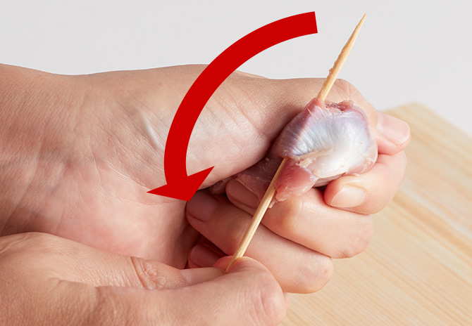 4.刺しこんだ竹串を手前に引き起こすようにして、銀皮をはがしやすくします。