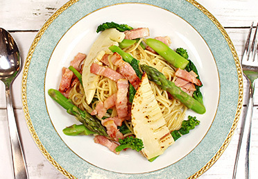 アスパラとたけのこの春野菜ベーコンパスタ