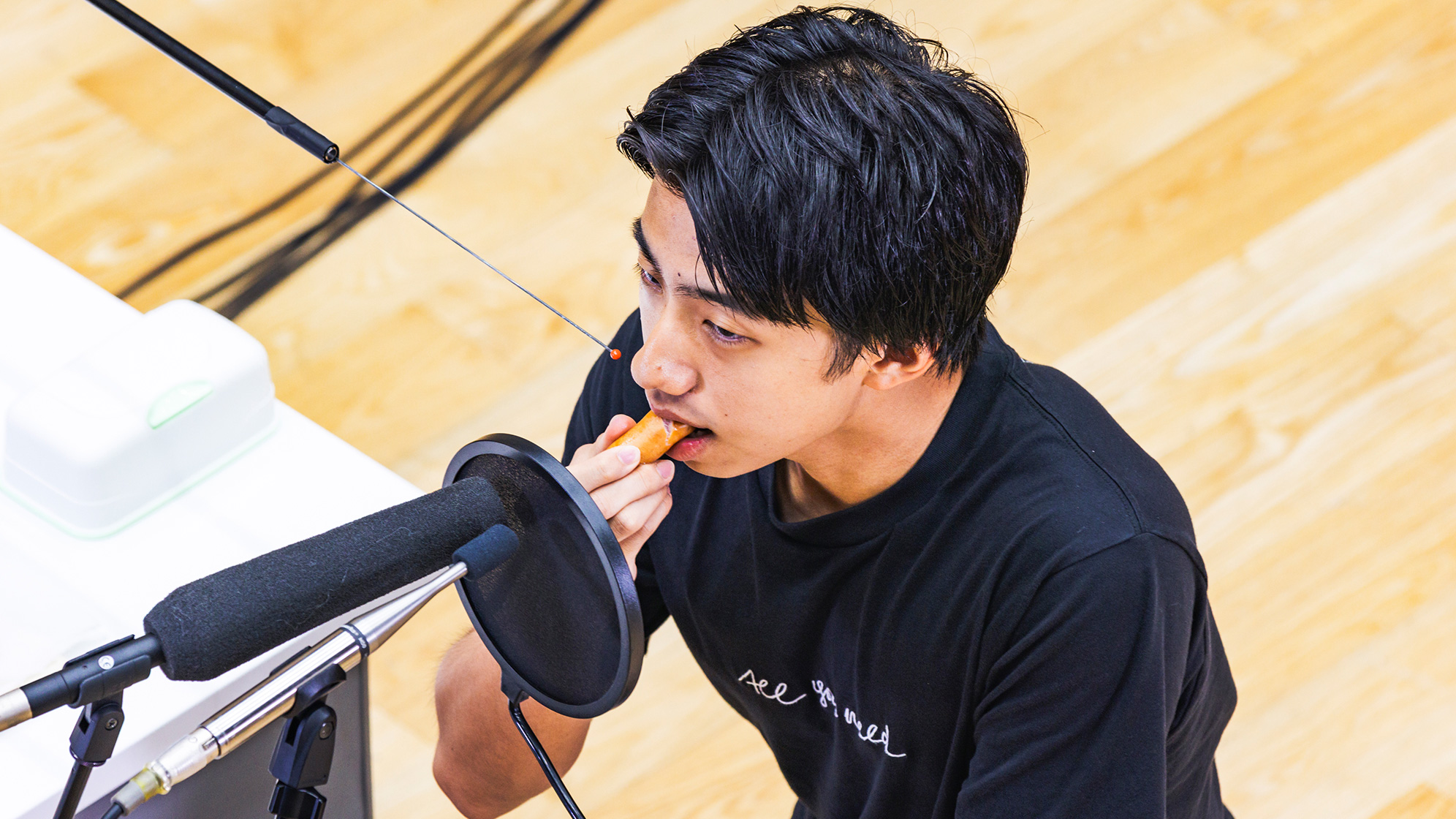 マイクには息のノイズが入らないようにするためのポップガードを設置し、約15cm離れた位置でウインナーを手に取り3分の1ほどを喫食してもらい収音した